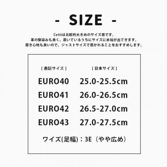 Cettiは比較的大きめのサイズ感です。革の馴染みも良く、履き心地も良いので、普段のサイズより1つ小さいサイズをおすすめいたします。